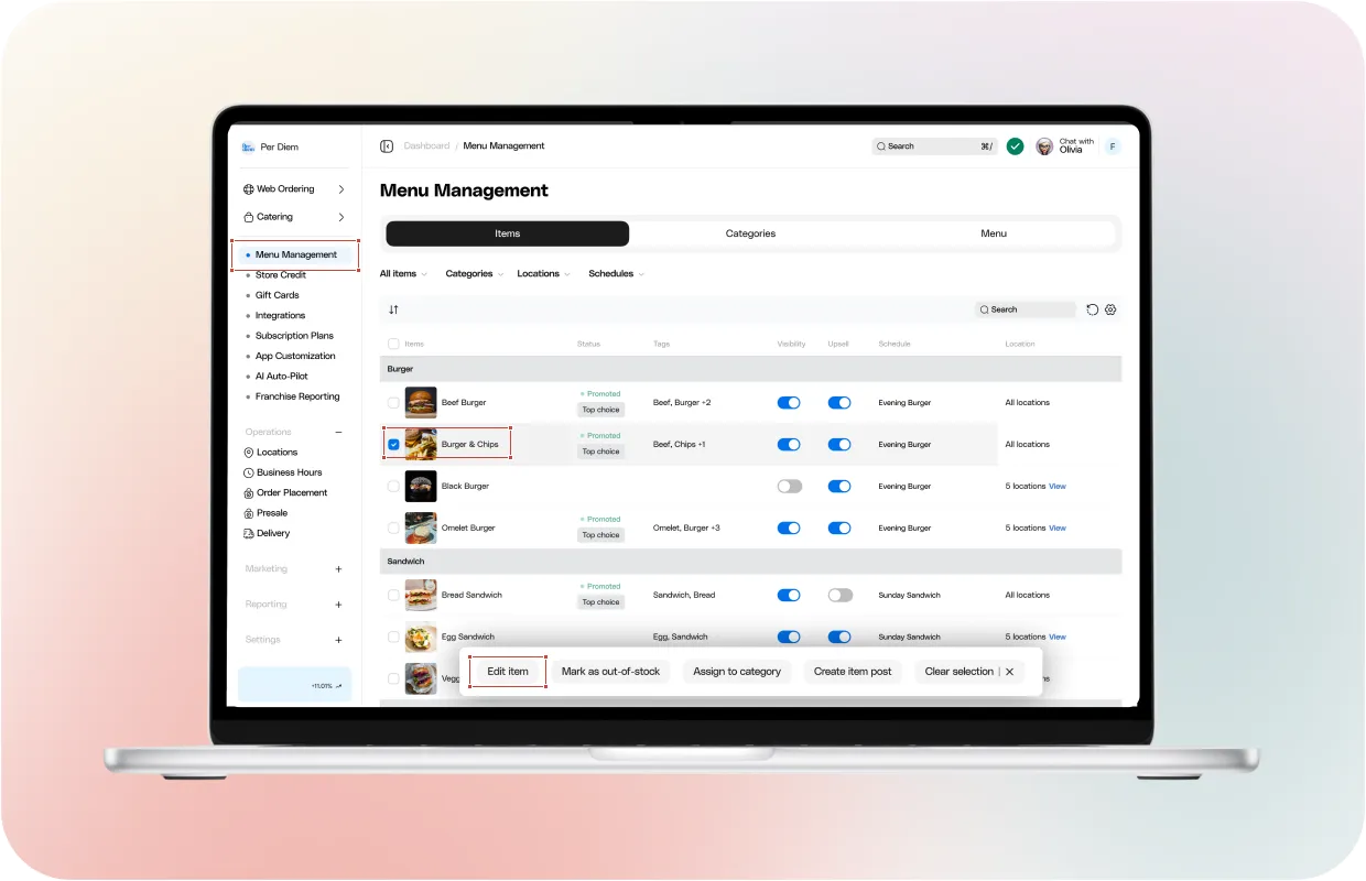 Categories help customers browse faster and understand your menu at a glance. With Per Diem, you can assign items to categories directly from the Items view without leaving the dashboard.