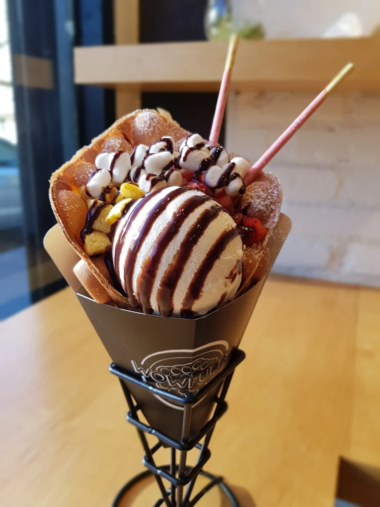 Wowfulls takes waffles into full dessert territory with egg-style Hong Kong waffles wrapped around scoops of ice cream. The texture is airy and crisp, creating the perfect shell for soft ice cream and colorful toppings. This spot leans fun and theatrical, which makes it a favorite for date days, family outings, and anyone who wants an Instagram-friendly treat. Customizing each waffle allows for endless combinations and the staff encourages sampling flavors.