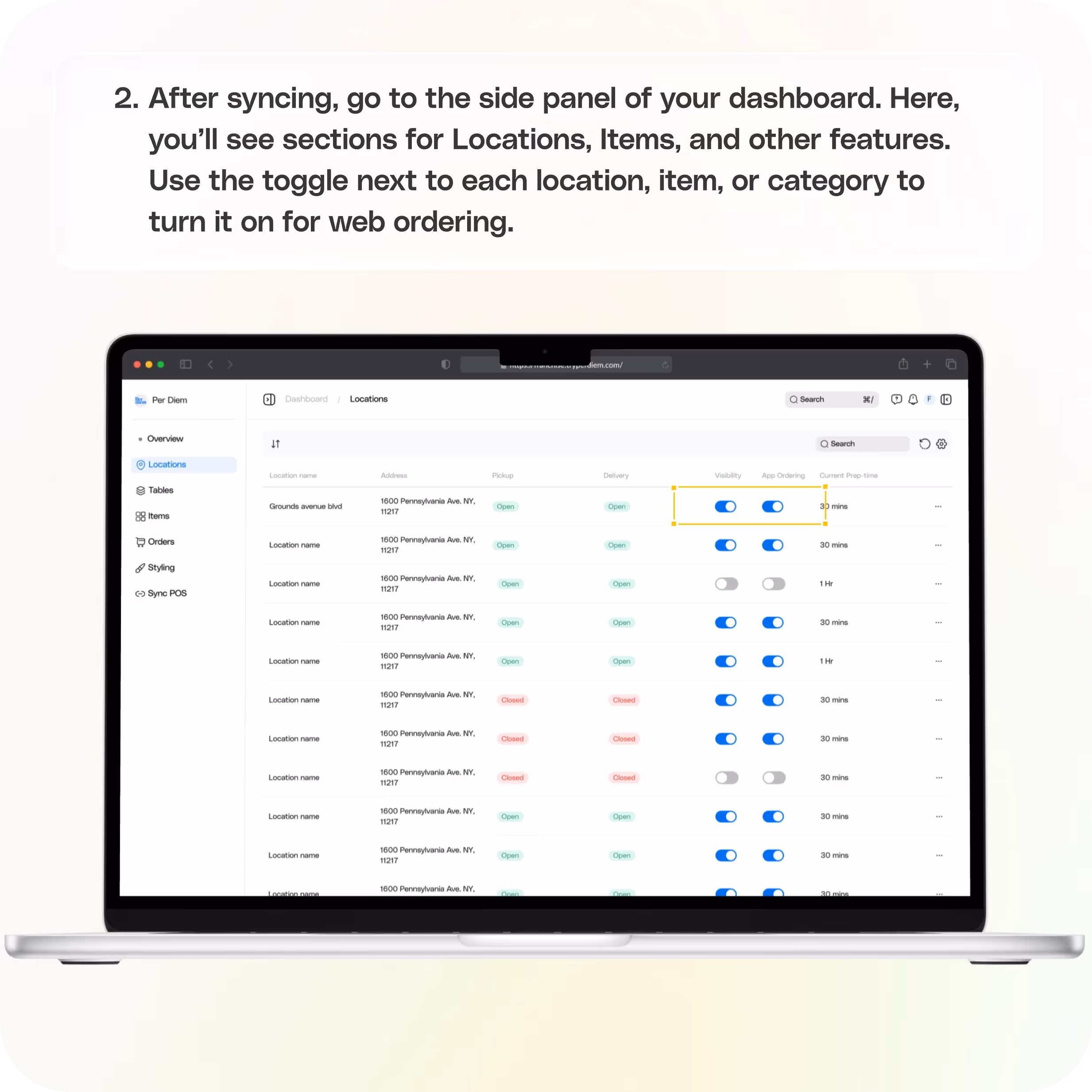Use the toggle next to each location, item, or category to turn it on for web ordering.