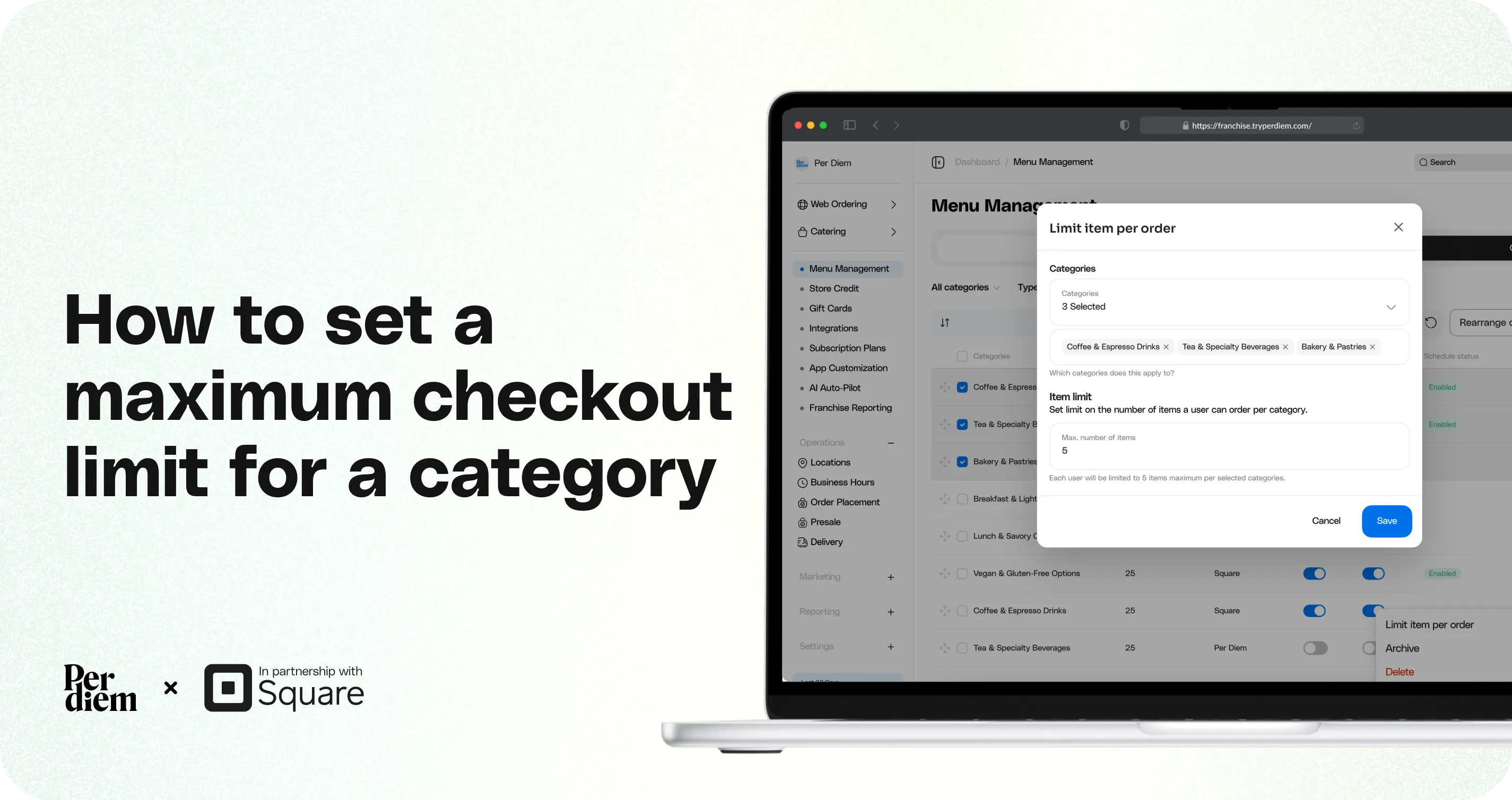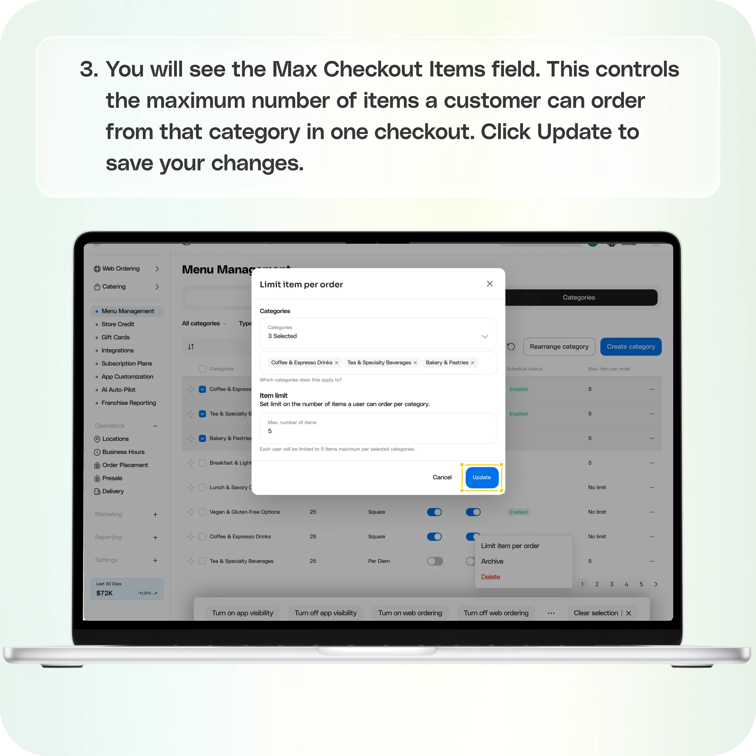 • Example: Enter 10 to limit customers to 10 items from that category per order