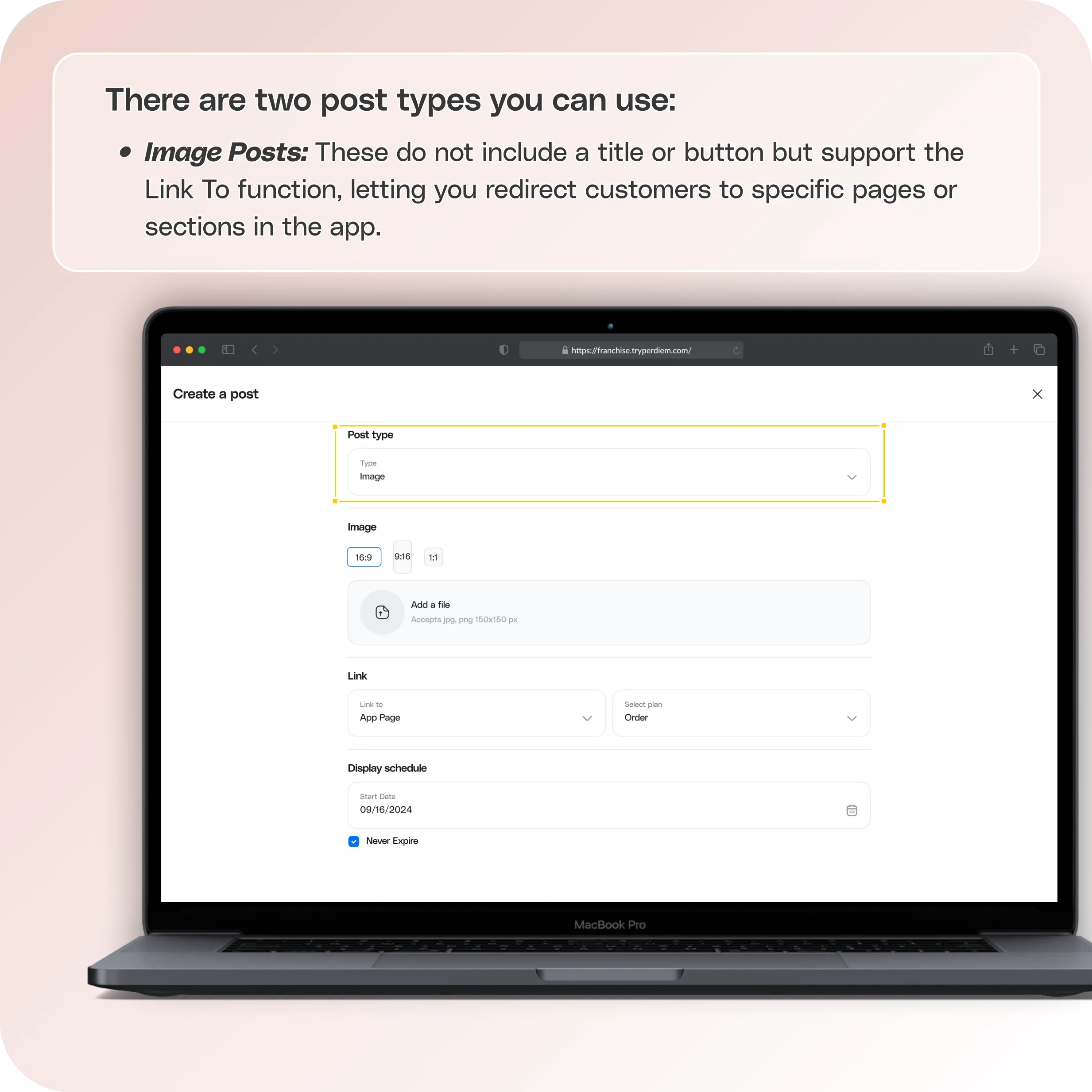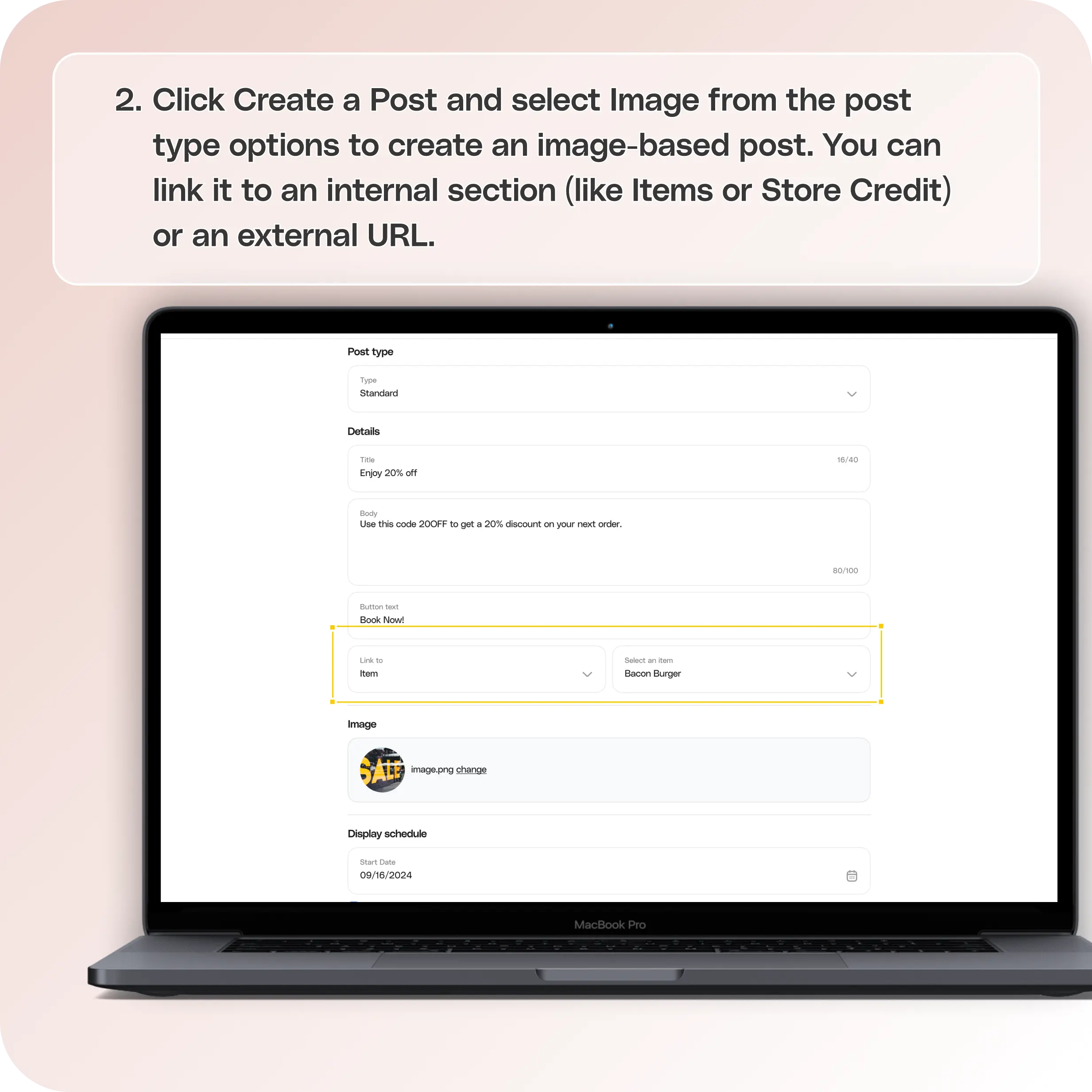 Choose your display schedule to control when your post appears in the app, then click Save to publish your post.