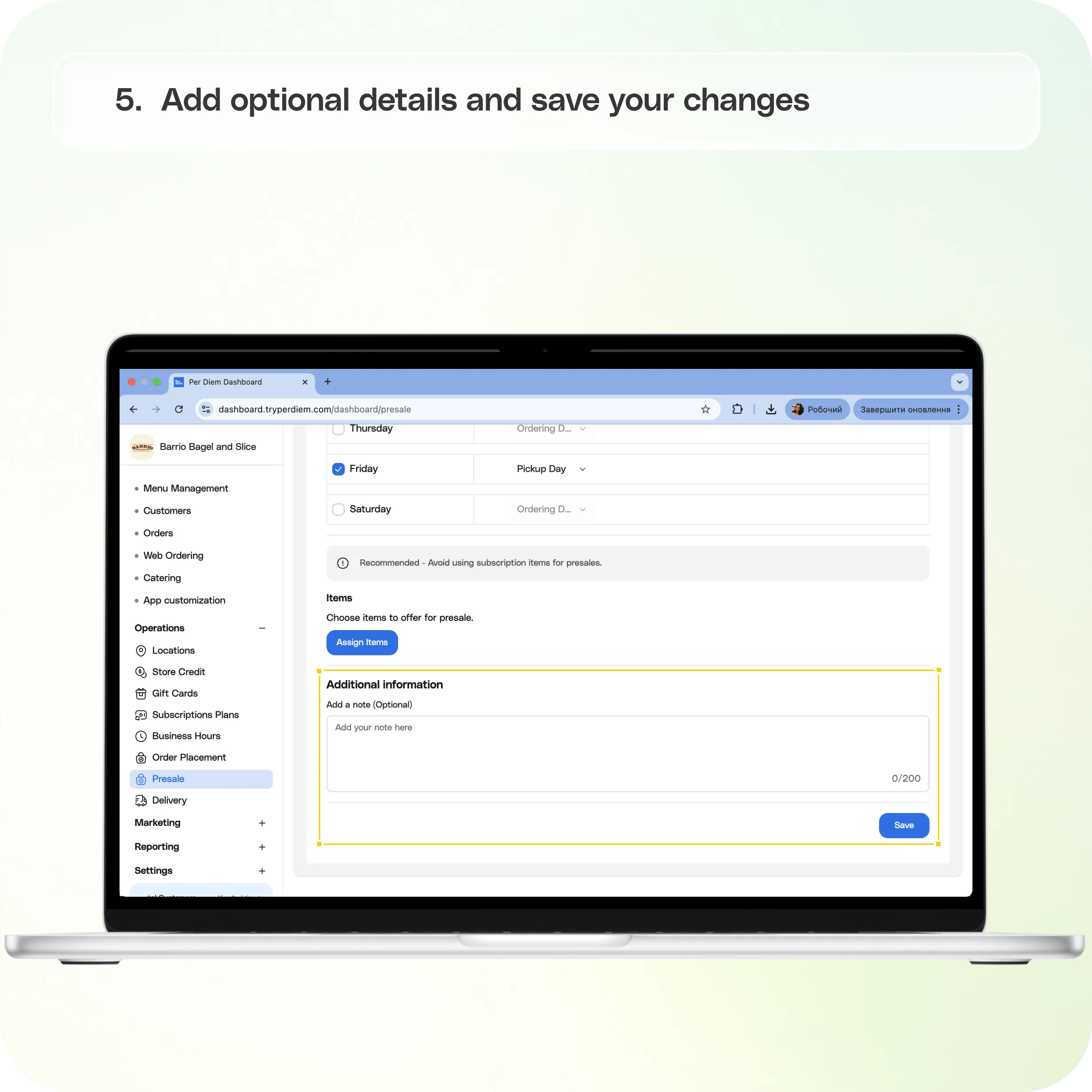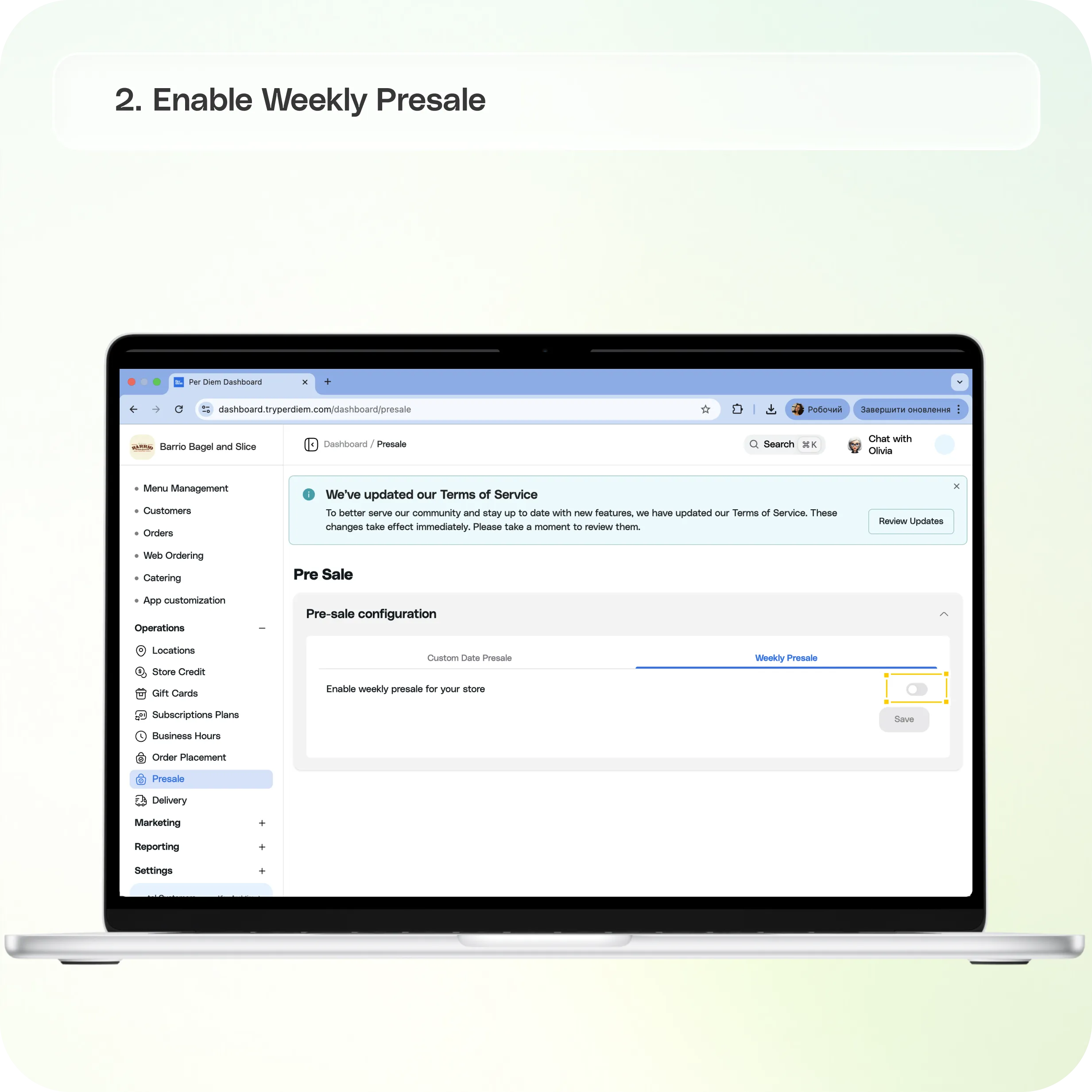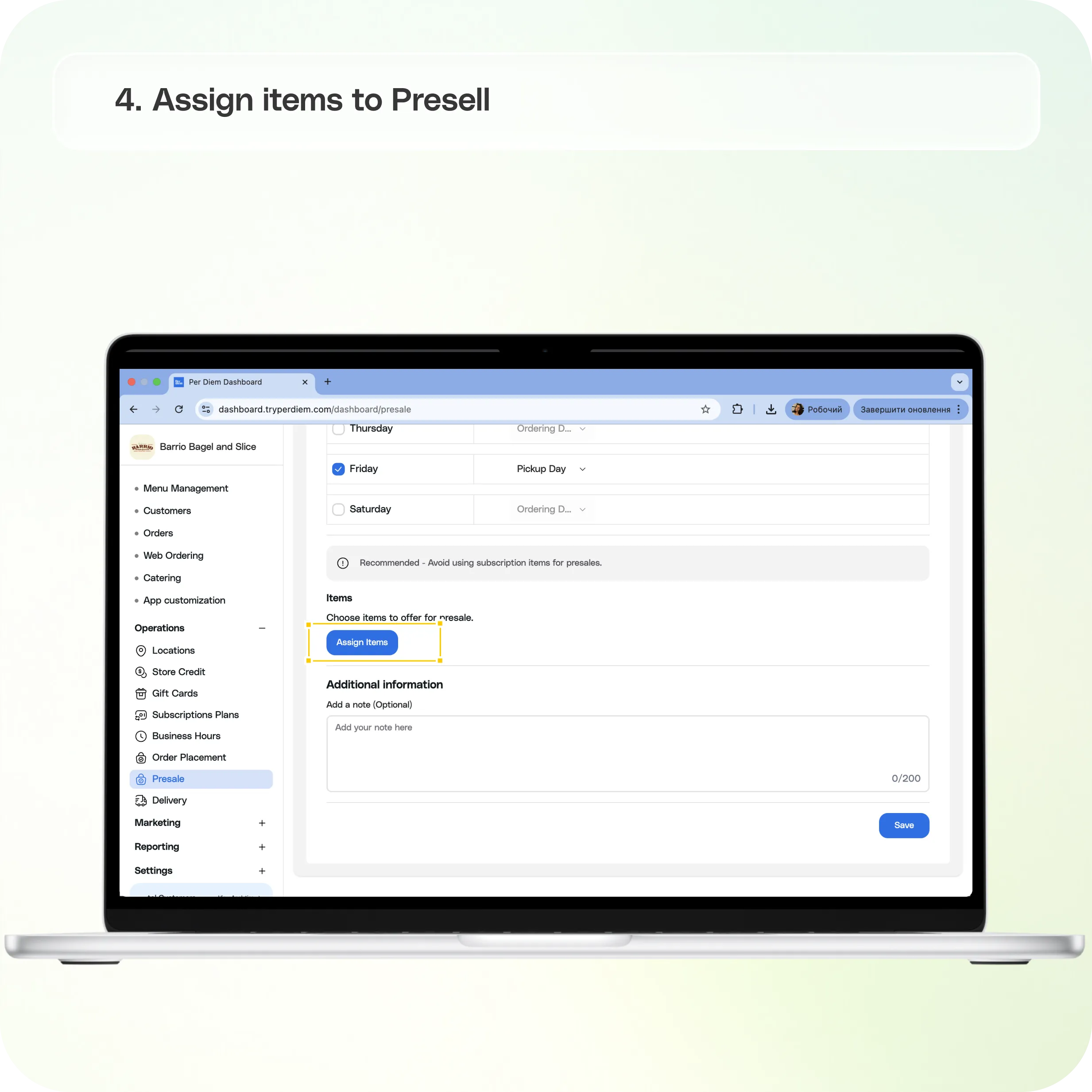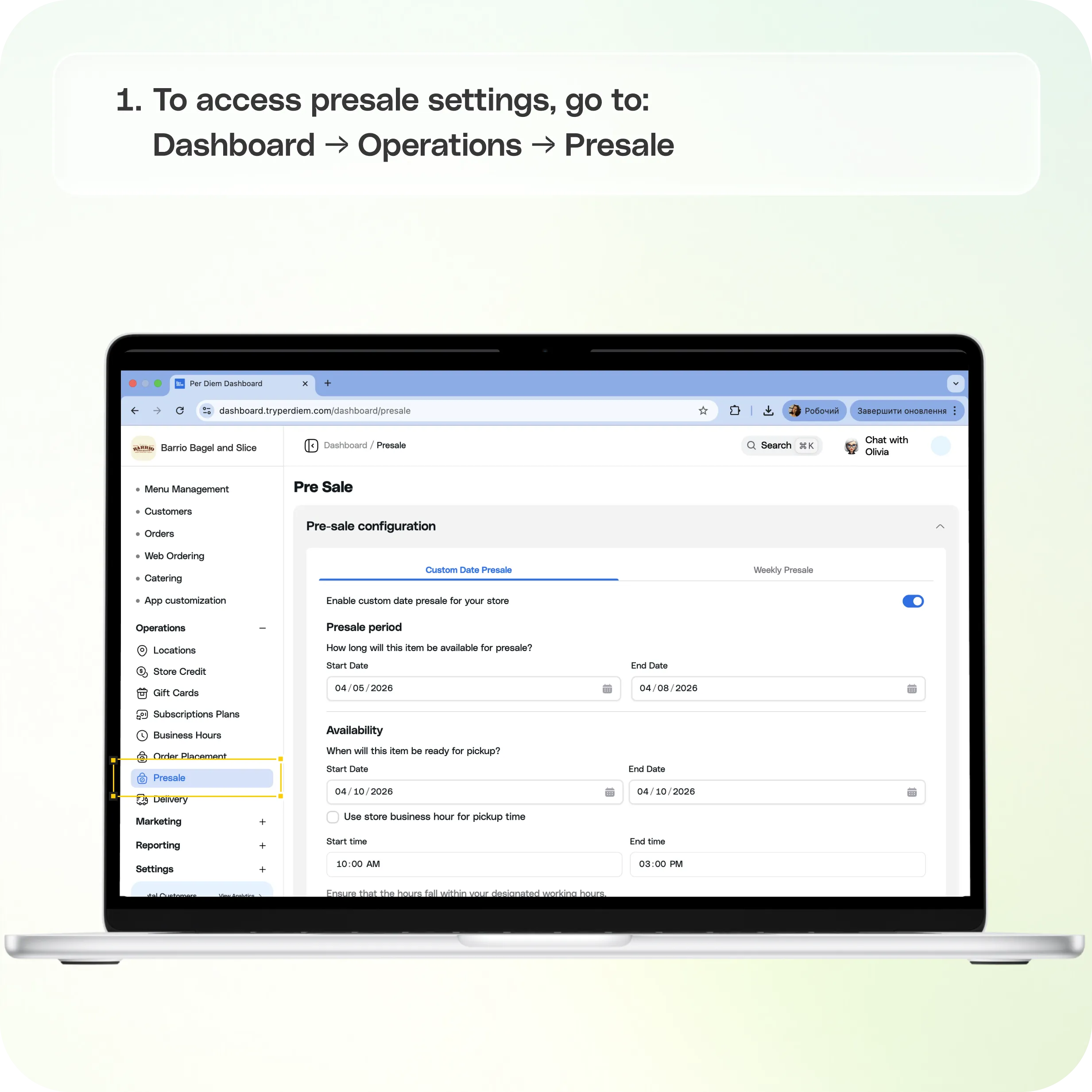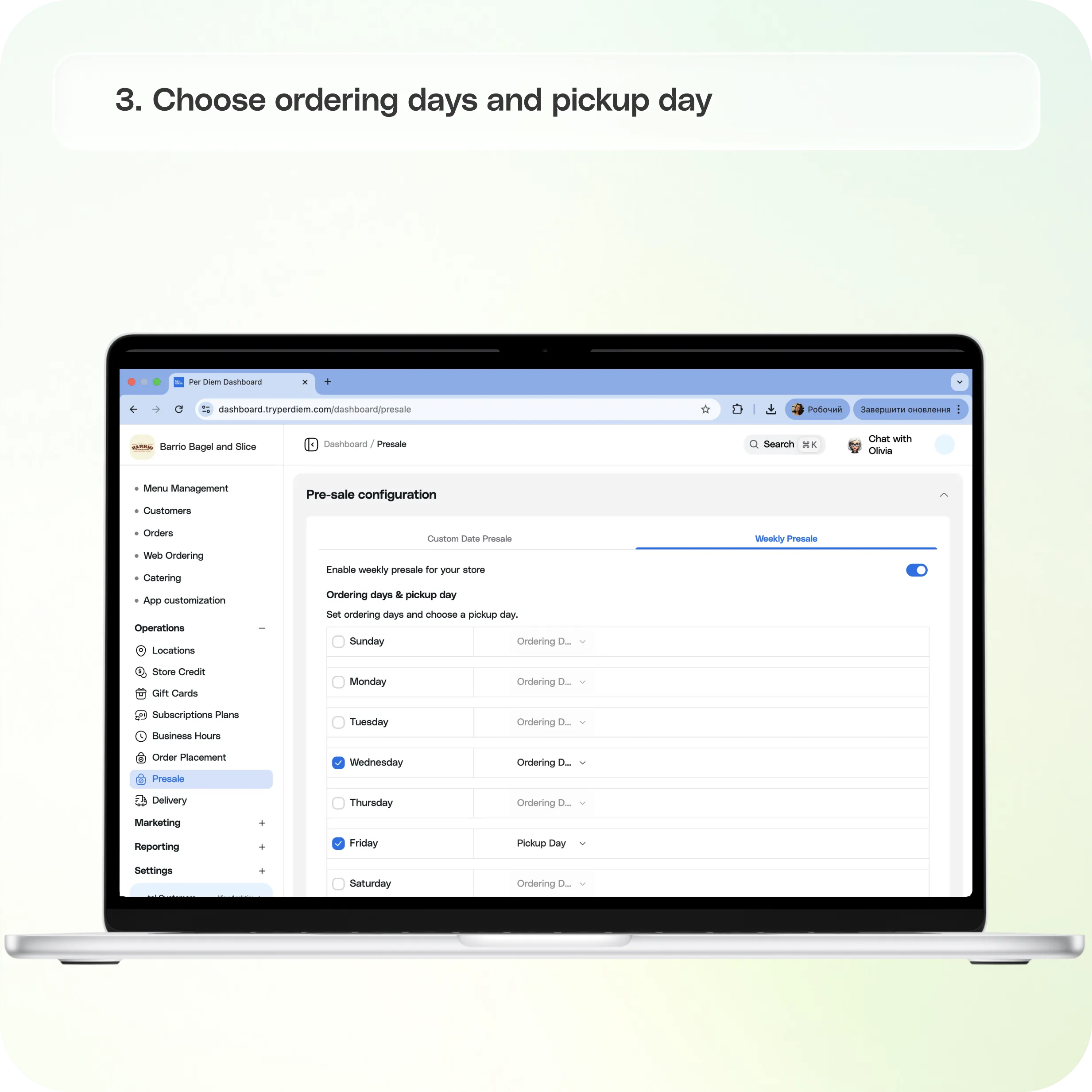 Weekly presale allows you to assign certain days as ordering days and a separate day as the pickup day.