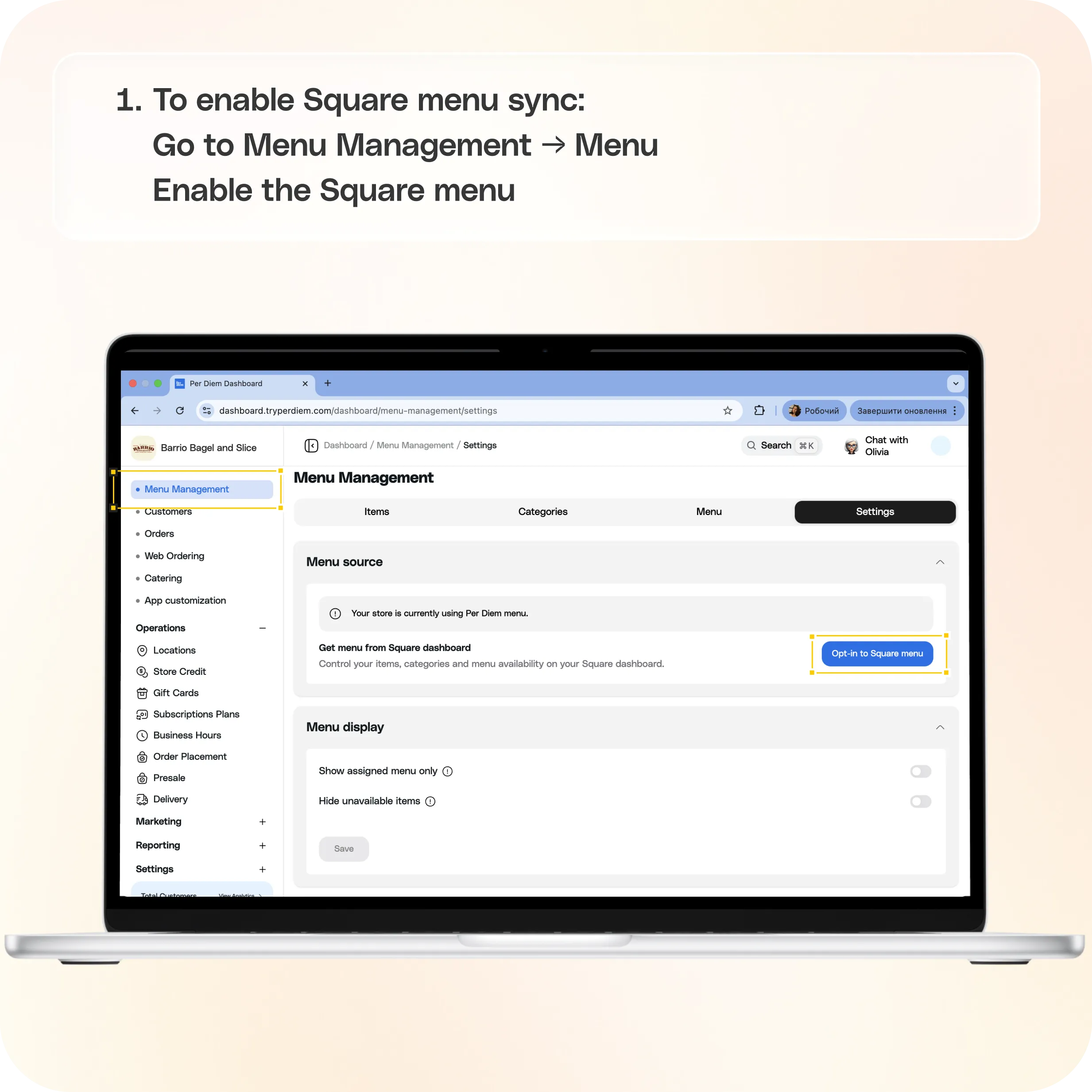 - Per Diem only controls visibility (on/off). To change menu order or structure, update it in Square → Menu.