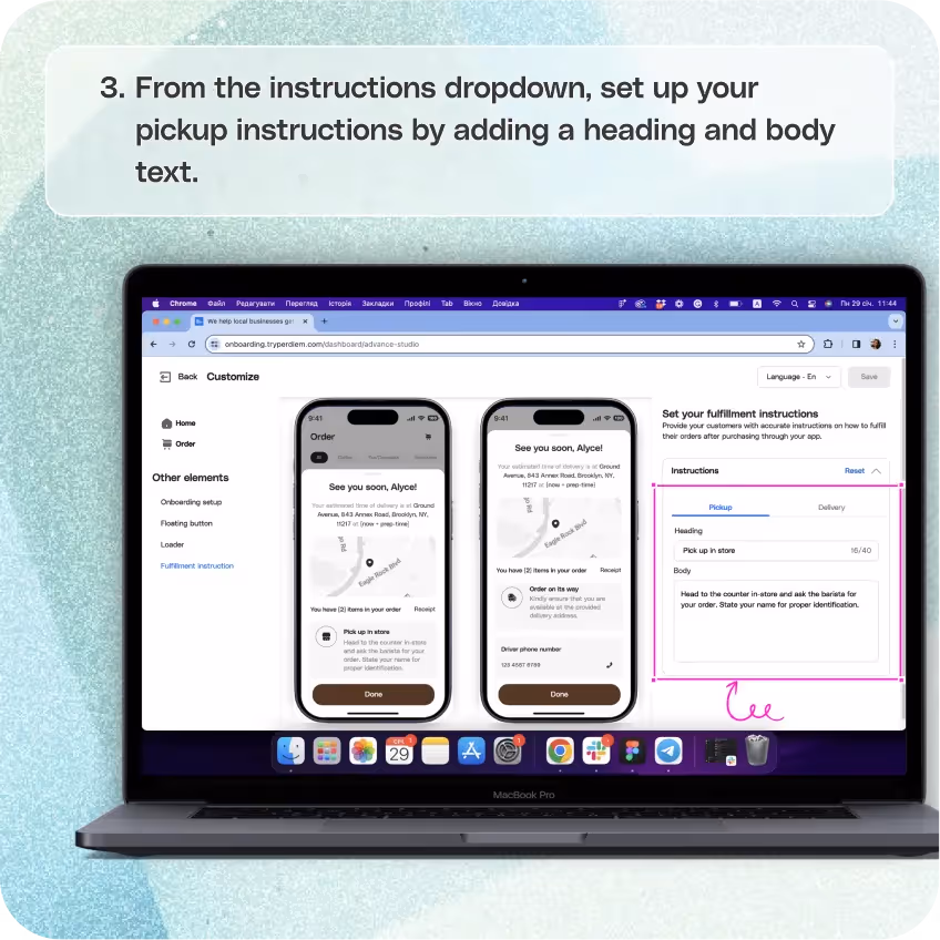 From the instructions dropdown, set up your pickup instructions by adding a heading and body text.