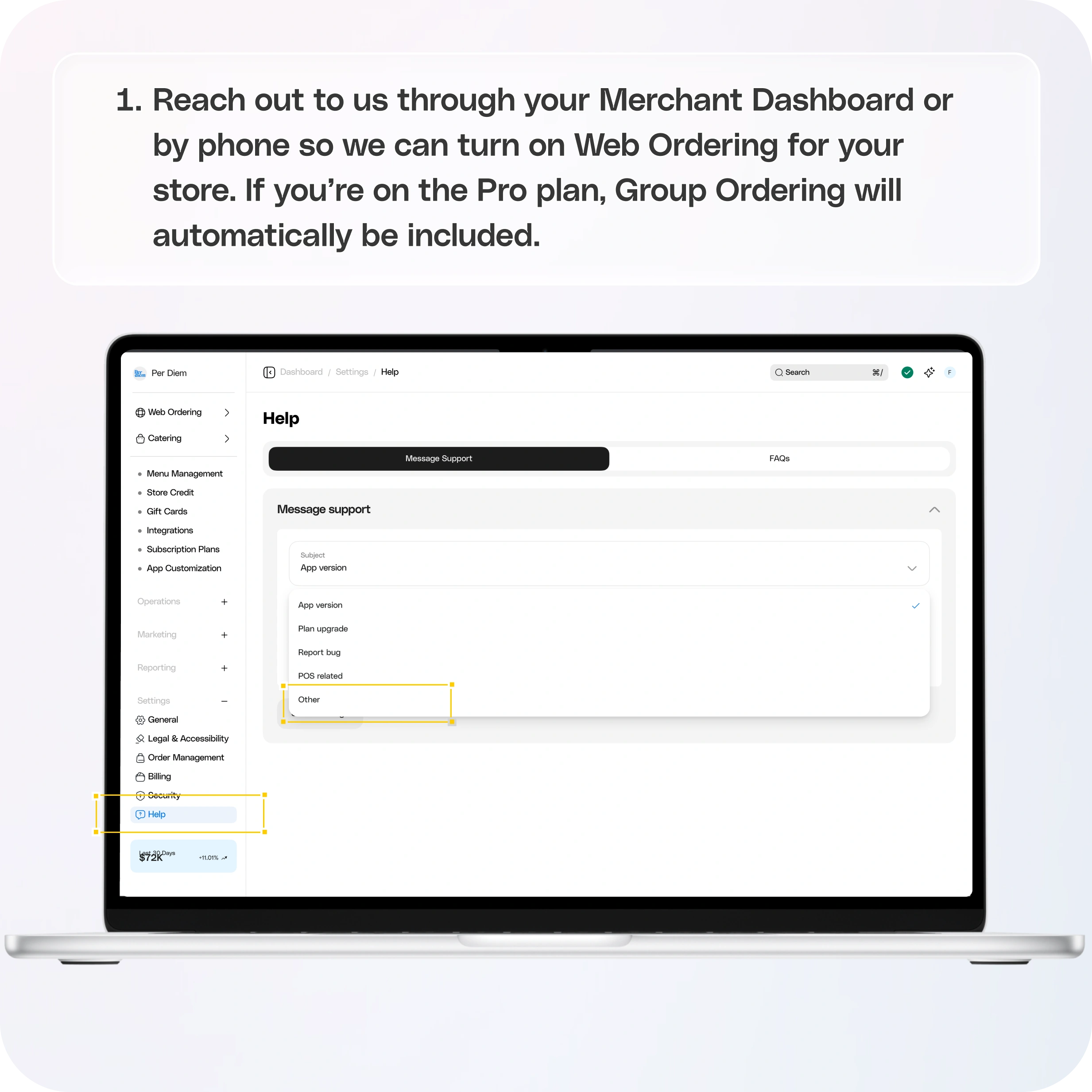 Reach out to us through your Merchant Dashboard or by phone so we can turn on Web Ordering for your store.