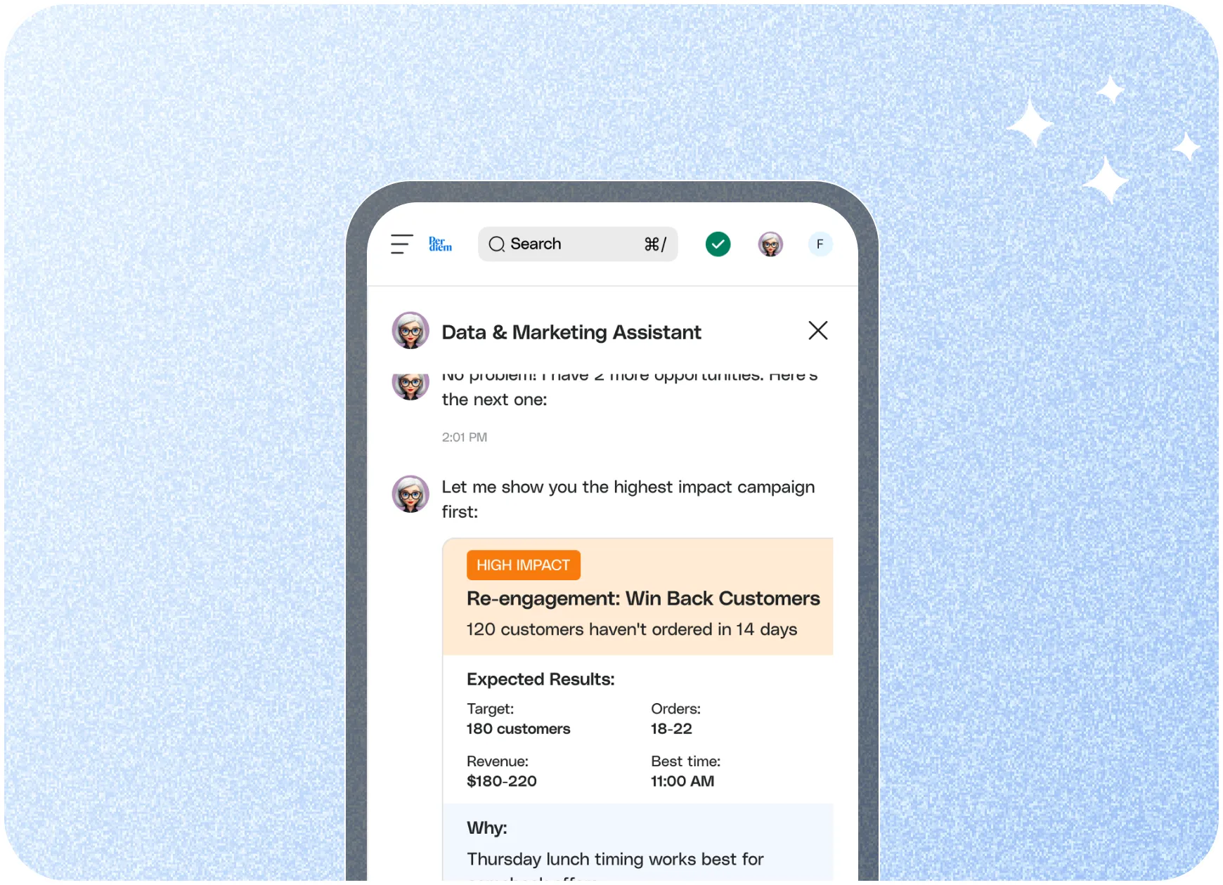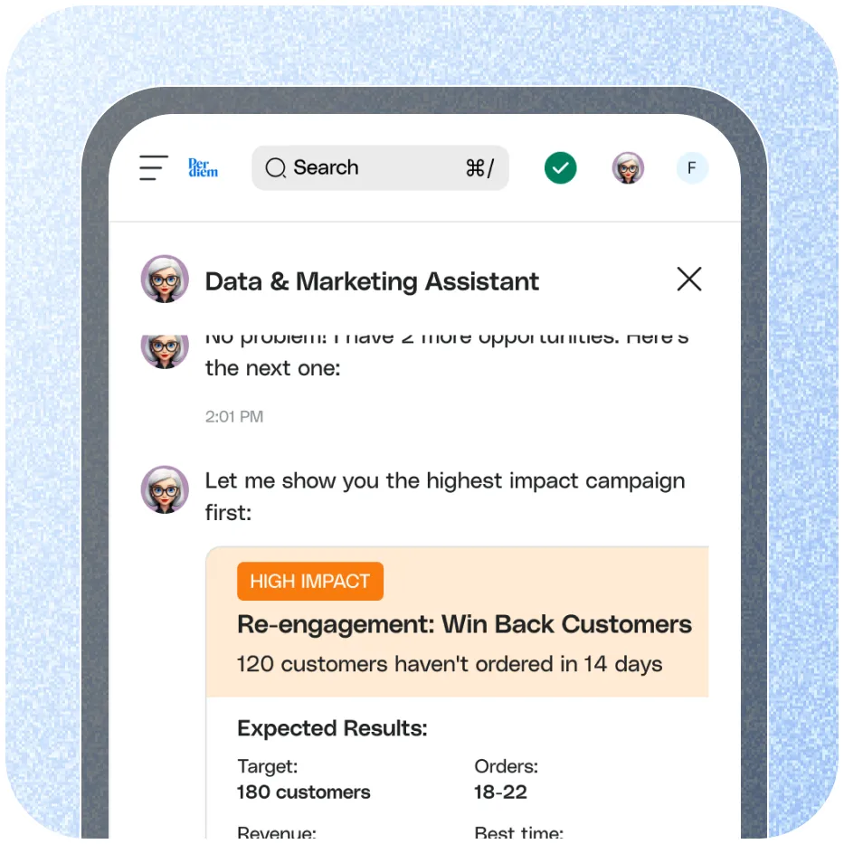 When sales slow down, you need to know what to do next.Ask Olivia how to improve slow days or increase order value. She recommends the best campaign based on your performance and customer behavior.