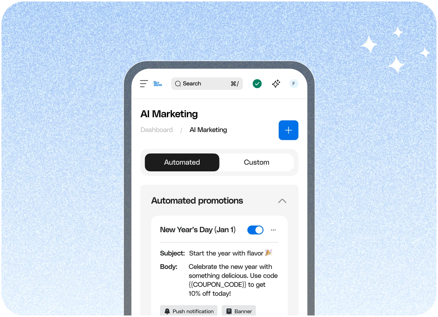 Turn on campaigns for any holiday from the New Year to Christmas. Your AI Marketing assistant runs them at the right time while you focus on your business.
