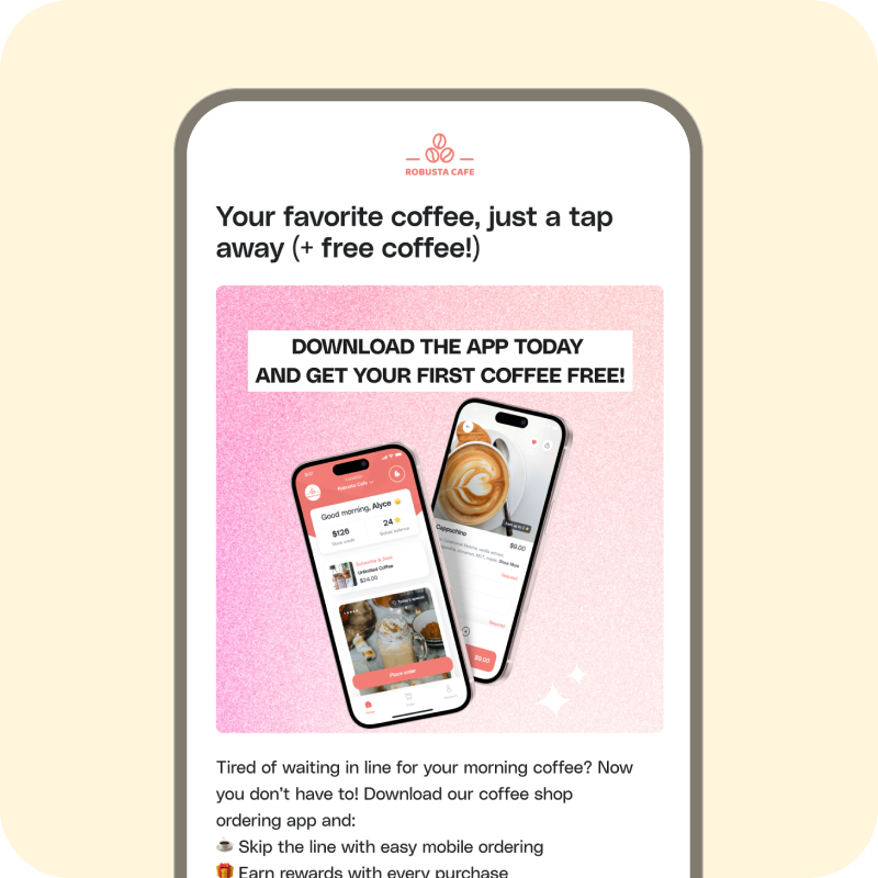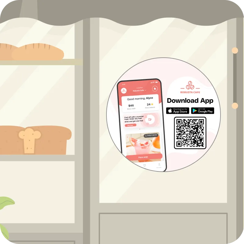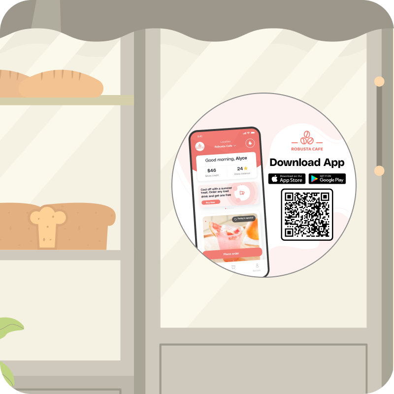 Level up your coffee shop's in-store experience. Place QR codes all around, making it a breeze for customers to find and score exclusive app-only deals. Get ready for your app downloads to soar.