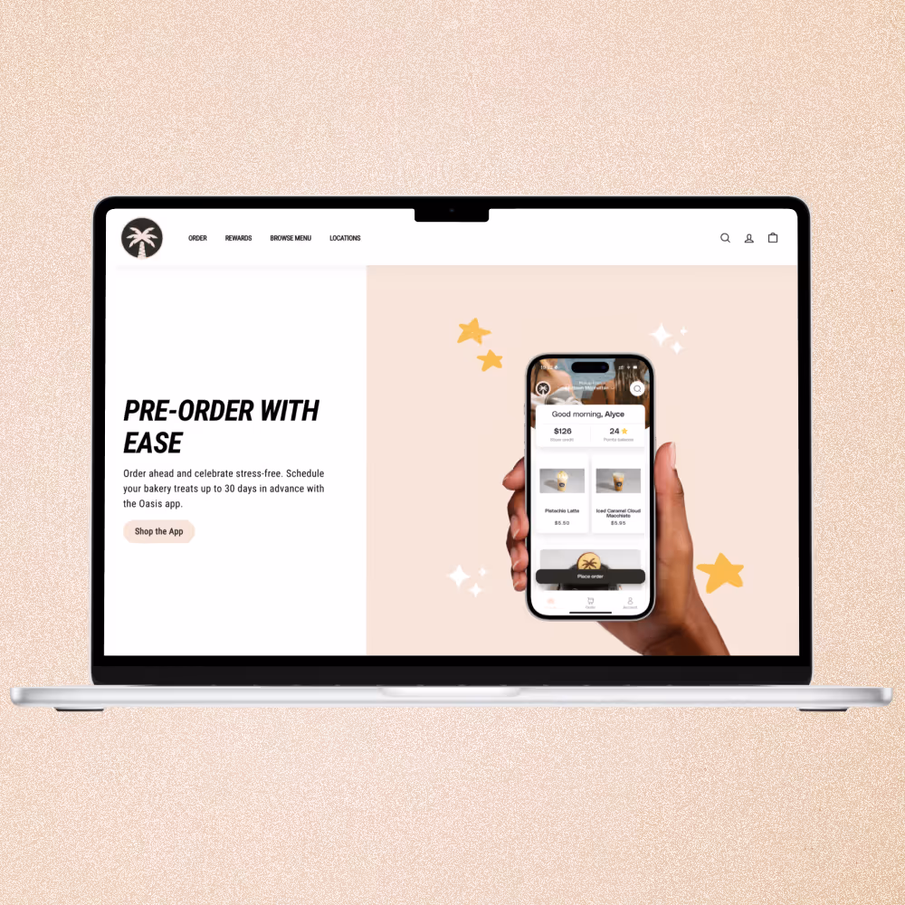 One of the simplest and most effective ways to drive more app downloads and orders is by making your app visible on your website. People can't use what they don't know exists, so placing your app front and center matters. A great example of this in action is Oasis Cafe NYC. When you land on their website, it’s immediately clear that the app is part of the experience, not an afterthought. Their navigation bar features a bold “Rewards” button that sparks curiosity and leads to a page explaining how customers can earn unlimited perks just by ordering through the app. It’s a smart way to connect value with action. On top of that, they highlight their pre-order feature right on the homepage, showing visitors they can skip the line and save time. It’s a small shift in placement, but it creates a smoother path from browsing to ordering.